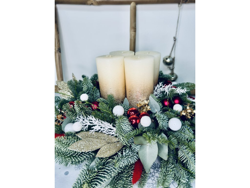 Kombinuje přírodní jedlové větvičky, zlaté listy, bílé a červené ozdoby a čtyři velké svíčky s jemným přechodem do zlatavé barvy. Dokonalý doplněk pro tradiční vánoční výzdobu, který rozzáří váš stůl po celé adventní období.