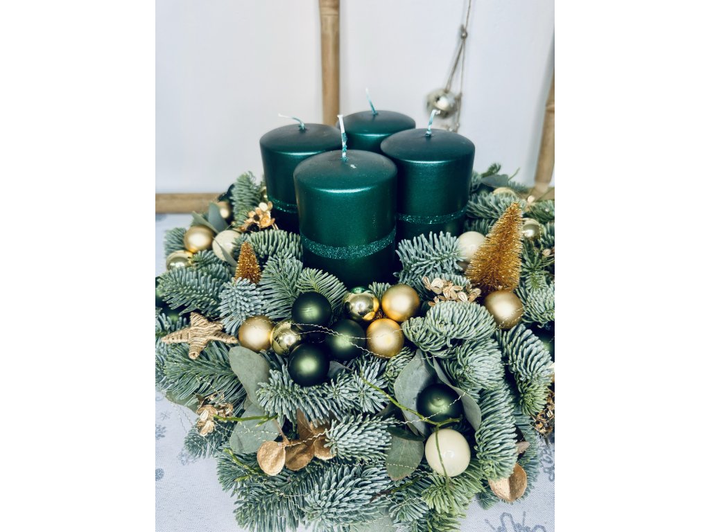 Luxusní zelený adventní věnec s hlubokými tóny lesa a zlatými akcenty.