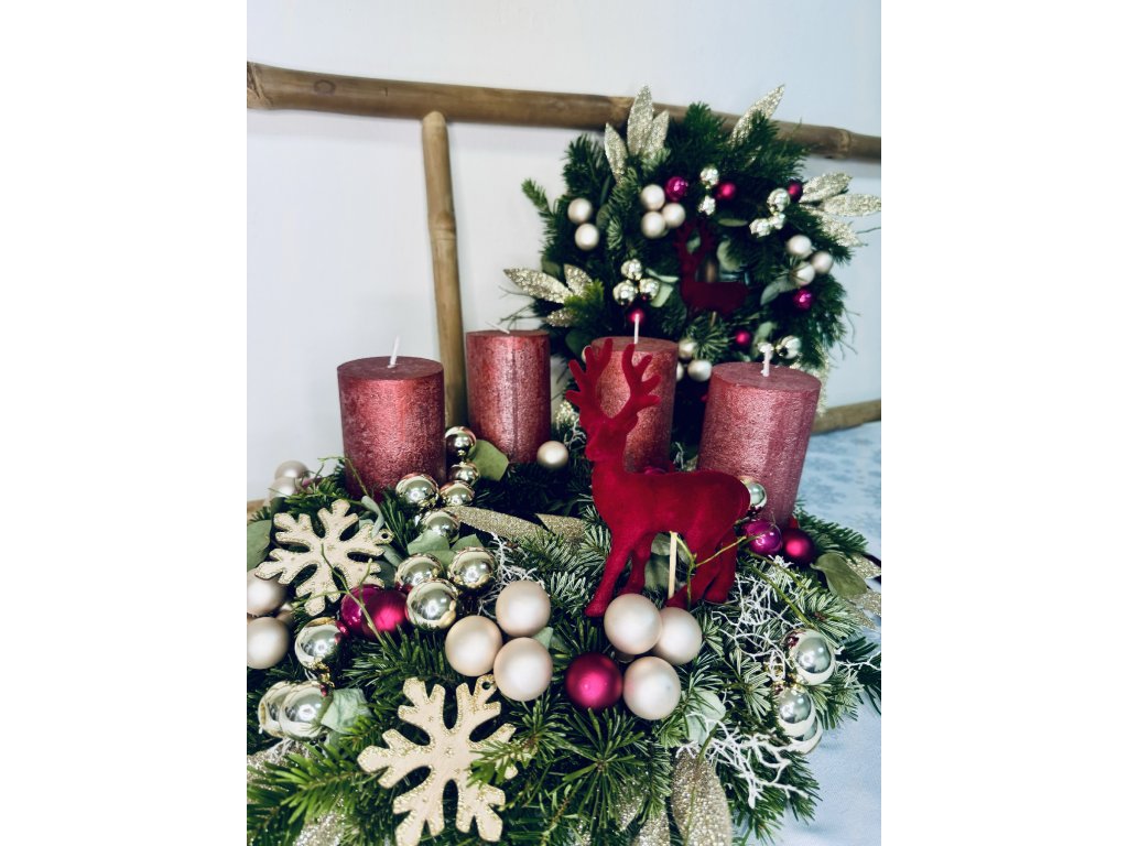 Kombinuje červené svíčky, sametového jelínka, sněhové vločky a koule v odstínech šampaňské a růžovočervené. Ideální pro ty, kdo milují sváteční atmosféru s nápaditým detailem.