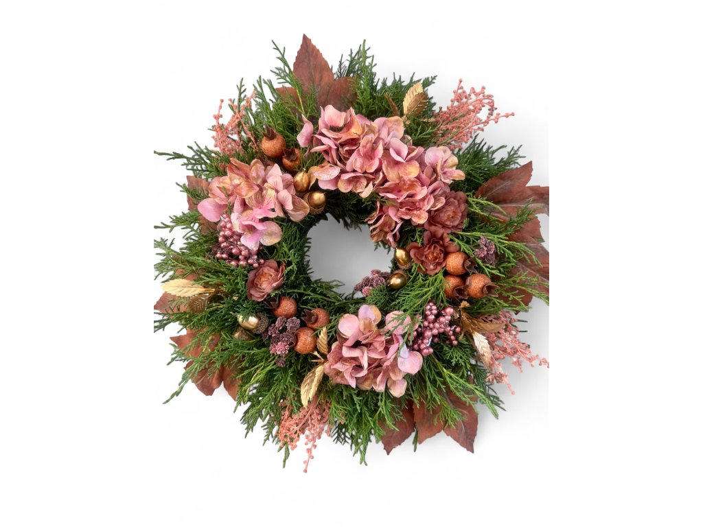 Elegantní věnec v jemných přírodních tónech s růžovými květy hortenzie a decentními zlatými detaily. Působí slavnostně a velmi vkusně.