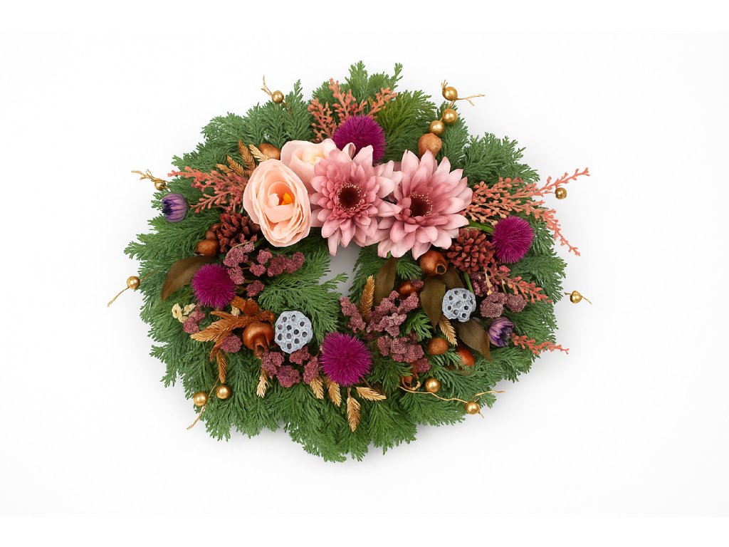 Jemný věnec, který spojuje růžové a fialové tóny s přírodninami. Působí elegantně a klidně, ideální pro ty, kteří hledají decentní, ale výjimečnou vzpomínku pro své blízké.