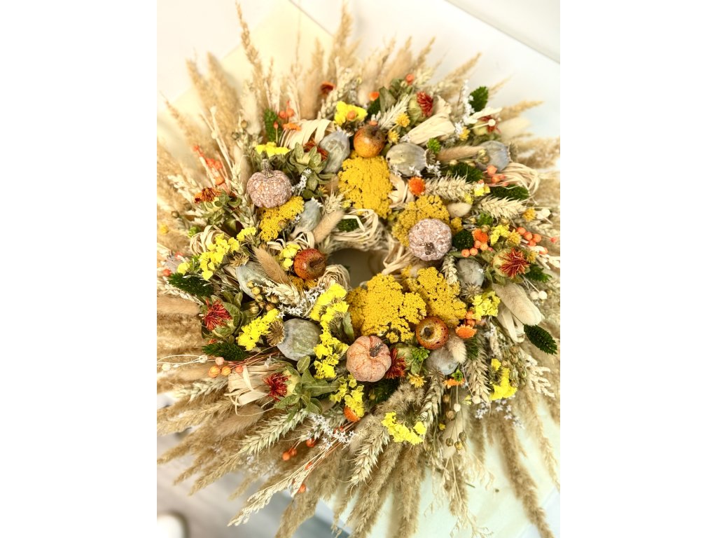 Věnec z trav a sušiny v barvách podzimu. Je zdoben umělými dýněmi a jablíčky. Takto krásný zůstane několik let.