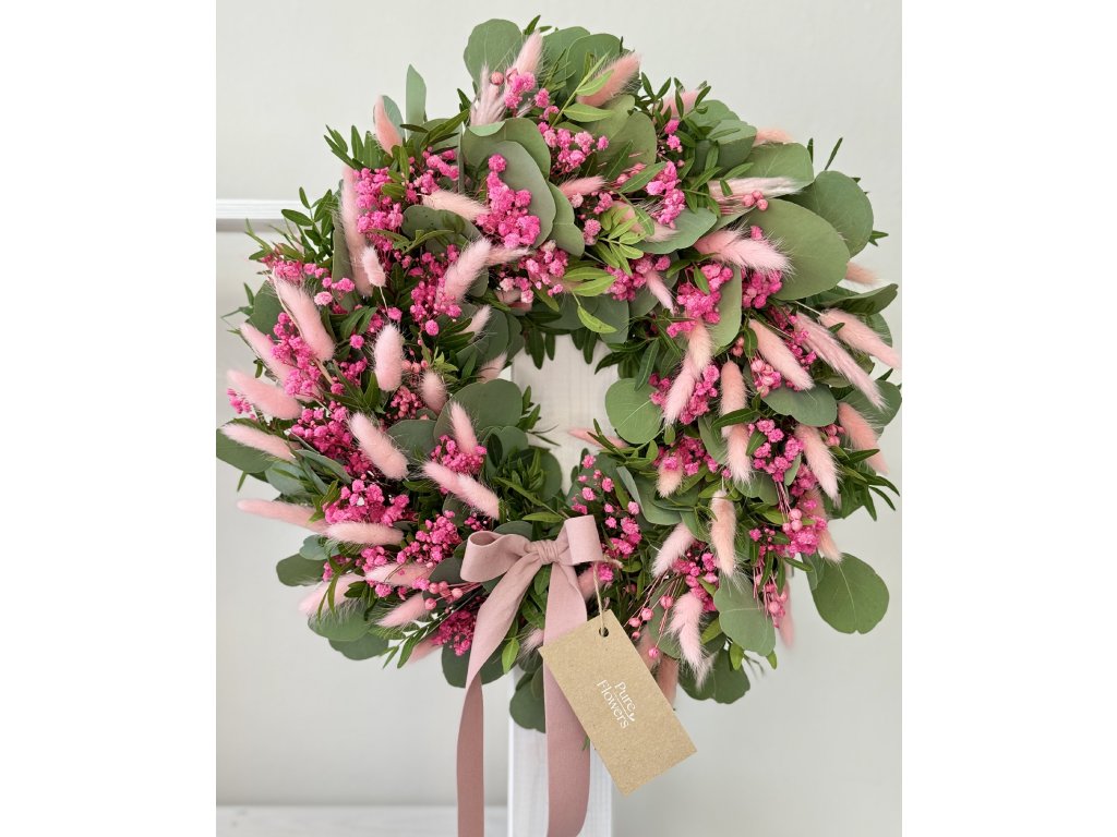 Věnec z eukalyptu a pistácie ozdoben sušenými rostlinami v růžové barvě.