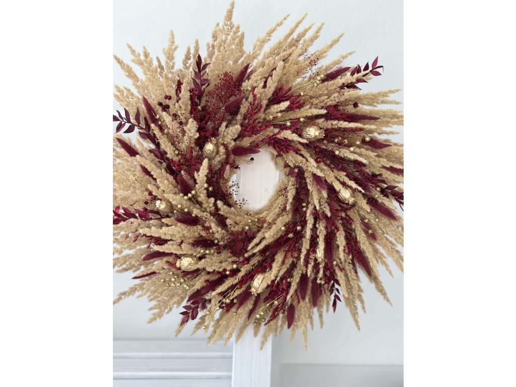 Nádherný věnec z trav, rudých stabilizovaných květin, zlatých makovic a lnu.